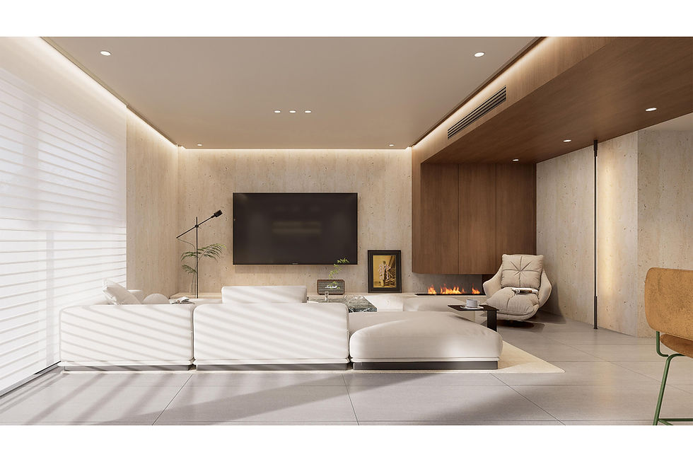 El proyecto combina la elegancia del travertino con la calidez de la madera de nogal, creando un equilibrio entre sobriedad y sofisticación. A través de un enfoque arquitectónico, se utilizan los materiales para definir volúmenes y generar una sensación tridimensional que potencia la profundidad del espacio.