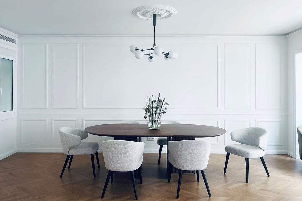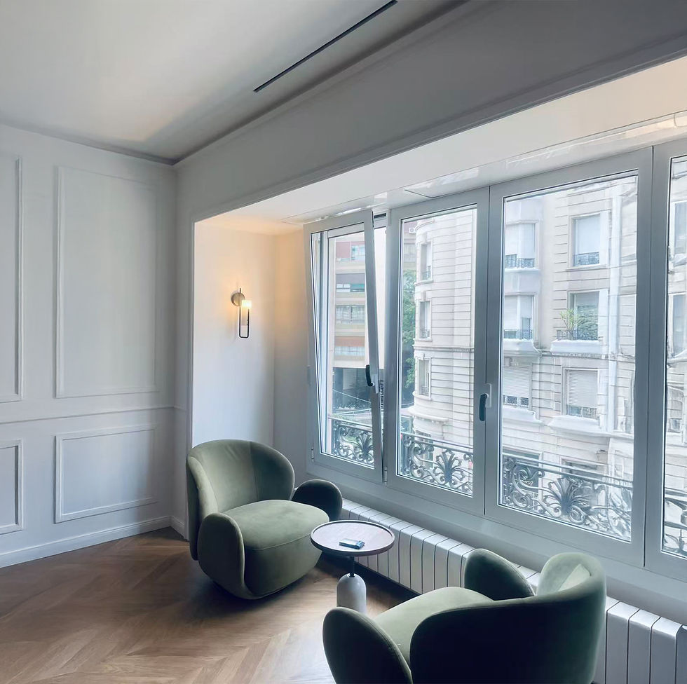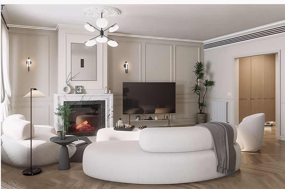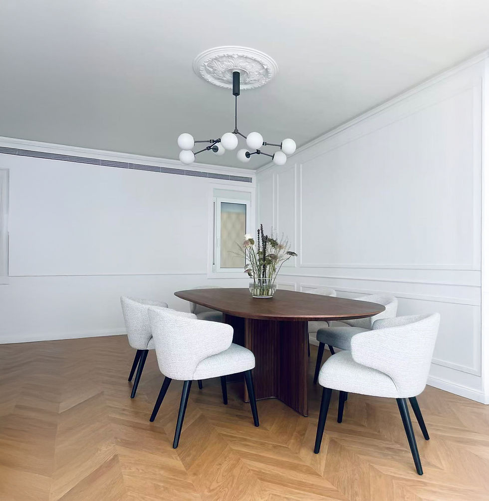 El proyecto adopta un estilo francés contemporáneo, donde la elegancia clásica se combina con líneas limpias y una paleta de colores suaves. Los moldurados sutiles, los tonos neutros y la iluminación cálida aportan un aire refinado sin perder la sensación de frescura y ligereza.
